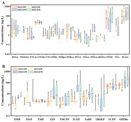 Concentrations of the PFASs (A) and OPFRs (B) in the upper Yangtze River in 2022 and 2023. SW: surface water, EW: effluent wastewater. Box charts (bottom to top) presented the 5th, 25th, 50th, 75th, and 95th percentile values. The absence of a box indicates that the detection rate of the compound is less than 50%.