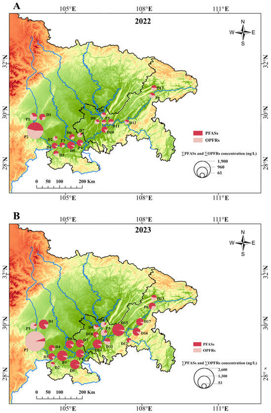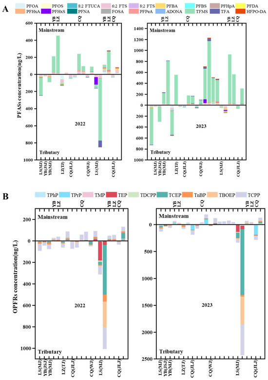 Cumulative concentrations of PFASs and OPFRs in the samples collected during 2022 (A) and 2023 (B) in the upper Yangtze River.