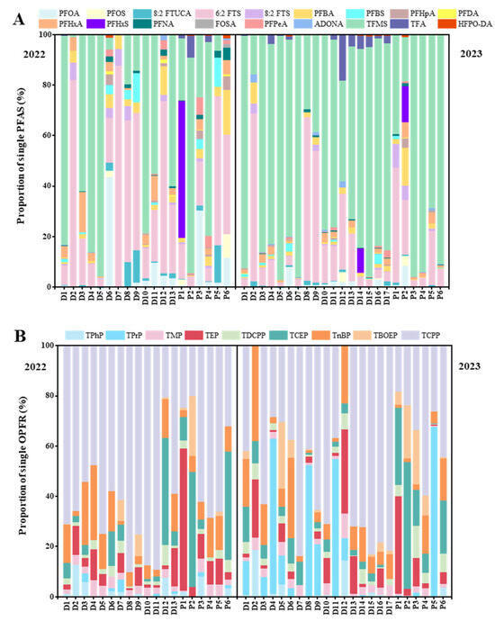 Relative contributions of individual composition to the total PFASs (A) and OPFRs (B) in water samples from the upper Yangtze River.
