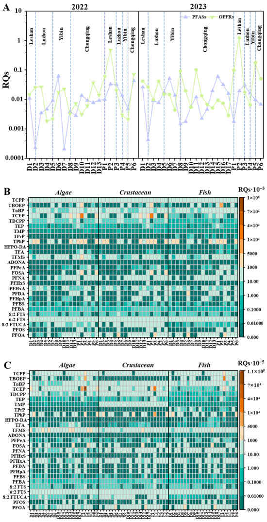 Risk quotients of PFASs and OPFRs. (A) The total risk quotients (RQSTU). Ecological risks related to individual compounds in 2022 (B) and 2023 (C) for algae, crustaceans, and fish in each water sample.