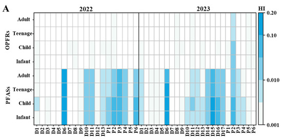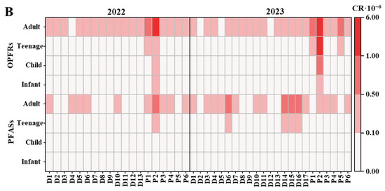 Health risks from chemicals in aquatic environments are often linked to the human ingestion of drinking water [17,95]. Since some of the sampling points in this study were near water sources, drinking water intake was chosen as the basis for the health risk assessment. The results of hazard indices (His) and carcinogenic risks (CRs) for health-related PFASs and OPFRs are presented in Figure 7 and Table S16. For both individual compounds and the total concentration of PFASs (∑PFASs) and OPFRs (∑OPFRs), the non-carcinogenic (HI < 0.2) risk values were below theoretical risk (HI < 1) thresholds, suggesting that exposure to PFASs and OPFRs via surface water is likely safe for local residents. In general, the non-carcinogenic (non-CR) risk of PFASs was higher than that of OPFRs (Figure 7A). Notably, the non-carcinogenic risk of PFASs in Luzhou (Tuo River) and Chongqing (mainstream) was higher than that at other sampling points (Figure 7A). Regarding the age groups, the non-carcinogenic risk for PFASs followed the order: adult (2.50 × 10−1 in 2022 and 4.91 × 10−1 in 2023) > child (1.76 × 10−1 in 2022 and 1.60 × 10−1 in 2023) > teenage (1.13 × 10−1 in 2022 and 1.03 × 10−1 in 2023) > infant (6.70 × 10−2 in 2022 and 1.45 × 10−1 in 2023) (Table S16). The non-carcinogenic risk for OPFRs followed: child (1.48 × 10−3 in 2022 and 2.97 × 10−3 in 2023) > infant (1.34 × 10−3 in 2022 and 2.69 × 10−3 in 2023) > teenage (9.50 × 10−4 in 2022 and 1.90 × 10−3 in 2023) > adult (9.67 × 10−4 in 2022 and 1.43 × 10−3 in 2023) (Table S16). The non-CR risk level of PFASs in this study was higher than that of Chongqing surface water [37], while the non-CR risk level of OPFRs was lower than that of previous studies on Yangtze River surface water [32].