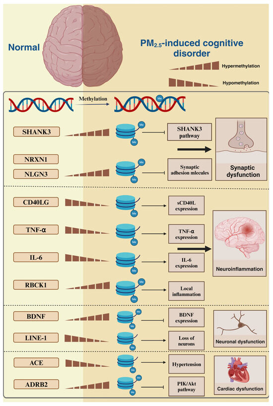 - Li, Z.; Liang, D.; Ebelt, S.; Gearing, M.; Kobor, M.S.; Konwar, C.; Maclsaac, J.L.; Dever, K.; Wingo, A.; Levey, A.; et al. Differential DNA Methylation in the Brain as Potential Mediator of the Association between Traffic-related PM2.5 and Neuropathology Markers of Alzheimer’s Disease. Alzheimer’s Dement. 2024, 20, 2538–2551. [Google Scholar] [CrossRef] [PubMed]