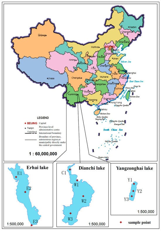 Ten sediment sampling sites were set up in the Dianchi, Erhai, and Yangzonghai lakes. Among them, four monitoring sites were set up in Dianchi Lake, located in Caohai Lake, as well as the northern, middle, and southern regions of Waihai Lake, which were numbered C1, W1, W2, and W3, respectively. Similarly, three monitoring sites were set up in Erhai Lake, located in the northern, central, and southern parts of Erhai Lake, denoted as E1, E2, and E3, respectively. Three monitoring sites were set up in Yangzonghai Lake, located in the north, center, and south of the lake and labelled Y1, Y2, and Y3, respectively. The specific sampling site positions are illustrated in Figure 1.