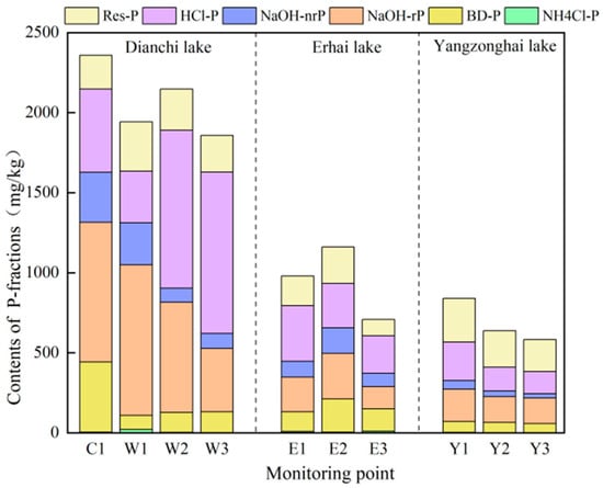 The average sediment TP contents in the Dianchi, Erhai, and Yangzonghai lakes were 2395.24, 1017.49, and 896.64 mg/kg, respectively. Dianchi Lake has a relatively high TP content, approximately twice that of Yangzonghai and Erhai Lakes. Different P-binding forms in the sediments demonstrate variations in P mobility and bioavailability []. Figure 2 shows the contents of different forms of P in the sediments of the Dianchi, Erhai, and Yangzonghai lakes. In Caohai Lake, the predominant form of P was NaOH-rP, which accounted for 34.72% of the total P content. Conversely, HCl-P was the featured P form in the Waihai and Erhai lakes, accounting for 33.10% and 28.70%, respectively, on average. In particular, the HCl-P in Waihai Lake was mainly distributed in the central and southern regions, whereas the other P forms were principally distributed in the northern region. HCl-P in Erhai Lake prevails extensively in the northern region, whereas other forms are concentrated in the central region. Res-P emerged as the leading form of P in Yangzonghai Lake, accounting for 25.99% of the P content. Regardless of form, the P content gradually decreased from north to south in Yangzonghai Lake. NH4Cl-P is the least concentrated form of P in lake sediments, comprising <1% of the TP. Being highly biologically active, NH4Cl-P is readily released into water, absorbed, and used by aquatic plants, resulting in a low content in the sediment [].