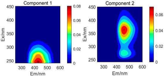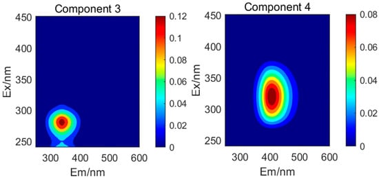 Fluorescence data were analyzed using the PARAFAC method to identify the DOM fluorescence components and their intensities. The data were imported into 3D specTALYZE 1.5 for noise removal and scattering correction. A three-dimensional projection or contour map was created based on the excitation and emission wavelengths and intensities. The specific excitation and emission spectra of each component (C1, C2, C3, and C4) were compared with the OpenFluor database to identify the corresponding substances.