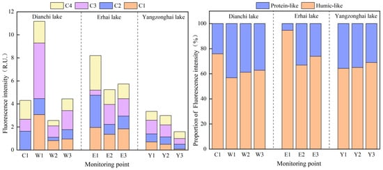 The fluorescence intensities and relative proportions of sediment DOM from various monitoring sites in the lake are shown in Figure 4. Erhai Lake exhibited the highest total average fluorescence intensity, followed by Dianchi Lake, with Yangzonghai Lake displaying the lowest average. It is worth noting that the northern region of Dianchi Lake exhibited a significantly higher total fluorescence intensity compared to the other areas of the lake. Moreover, the northern zone of Erhai Lake showed higher total fluorescence intensity than the southern and central zones. The total fluorescence intensity in Yangzonghai Lake decreased from the northern to the southern zones. The average proportions of the sum of C1, C2, and C4 in the sediments of Dianchi, Erhai, and Yangzonghai were 68.06%, 78.47%, and 66.08%, respectively, indicating that the sediment DOM in the three lakes mainly comprised humic-like substances. Humic-like components were more abundant in Caohai Lake compared to Waihai Lake, while in Waihai Lake, the concentration of humic-like substances displayed a declining gradient from south to north. In Erhai Lake, the northern region exhibited a significantly higher concentration of humic-like components compared to the central and southern regions. Additionally, a rise in humic-like material levels from north to south was confirmed in Yangzonghai Lake.