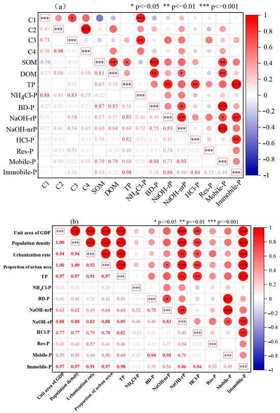 Correlation analysis of DOM and human activities with phosphorus. (a) The correlation coefficients between the P fractions and DOM characteristics. (b) The correlation coefficients between the P fractions and human activity indicators.