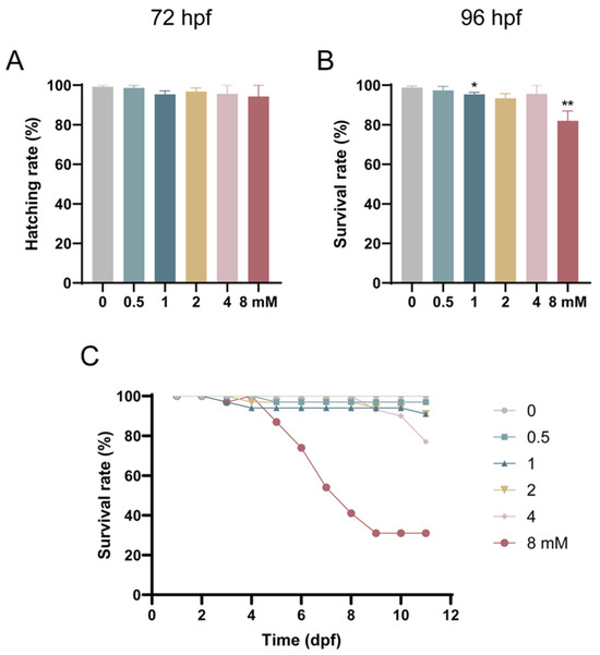 Developmental toxicity of levofloxacin exposure in zebrafish embryos. (A) Hatching rates of zebrafish embryos exposed to levofloxacin at 72 hpf; (B) survival rates of zebrafish embryos exposed to levofloxacin at 96 hpf; (C) survival rates of zebrafish larvae at different time points under different concentrations of levofloxacin. * p < 0.05; ** p < 0.01 vs. 0 mM.