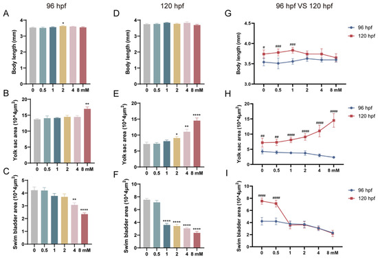 Morphological effects of levofloxacin exposure on zebrafish larvae at 96 hpf and 120 hpf. (A) Body length at 96 hpf; (B) yolk sac area at 96 hpf; (C) swim bladder area at 96 hpf; (D) body length at 120 hpf; (E) yolk sac area at 120 hpf; (F) swim bladder area at 120 hpf. * p < 0.05; ** p < 0.01; **** p < 0.0001 vs. 0 mM. (G) Comparison of body length between 96 hpf and 120 hpf; (H) comparison of yolk sac area between 96 hpf and 120 hpf; (I) comparison of swim bladder area between 96 hpf and 120 hpf. # p < 0.05; ## p < 0.01; ### p < 0.001; #### p < 0.0001 vs. same concentration at 96 hpf.