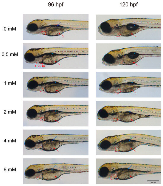 The swim bladder, indicated by the blue arrows in Figure 3, was examined in zebrafish larvae exposed to different concentrations of levofloxacin. At 96 hpf, the swim bladder area was significantly smaller in the 4 mM (p < 0.01) and 8 mM (p < 0.0001) groups than in the control group, with other experimental groups showing a similar trend of reduction (Figure 2C). At 120 hpf, all experimental groups, except for the 0.5 mM group, exhibited significantly smaller swim bladder areas compared to the control group (p < 0.0001) (Figure 2F). A concentration-dependent decrease in swim bladder area was observed at both 96 hpf and 120 hpf, reflecting impaired swim bladder expansion in zebrafish larvae exposed to higher concentrations of levofloxacin. In the 0 and 0.5 mM groups, the swim bladder area at 120 hpf was significantly larger than at 96 hpf (p < 0.0001), whereas no significant difference was observed between 96 hpf and 120 hpf in the 1, 2, 4, and 8 mM groups (Figure 2I).