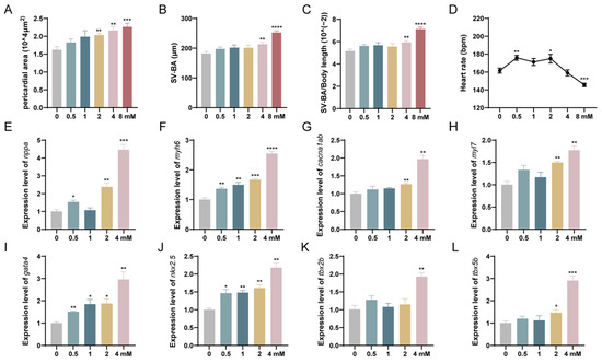 The effects of levofloxacin exposure on the cardiovascular system of zebrafish larvae were observed under a microscope. At 96 hpf, the area of the pericardial region in zebrafish larvae exposed to 2 mM (p < 0.01) and 8 mM (p < 0.001) levofloxacin was significantly larger compared to the 0 mM control group, while no significant changes were observed in the 0.5 mM and 1 mM groups, although a general increasing trend was observed (Figure 4A). Similarly, at 96 hpf, the length of the venous sinus-arterial bulb (SV-BA) and the ratio of SV-BA to body length were significantly increased in the 4 mM (p < 0.01) and 8 mM (p < 0.0001) groups (Figure 4B,C). Figure 4D shows the results of heart rate measurements taken at 72 h after exposure. Compared to the 0 mM group, the heart rate in the 0.5 mM and 2 mM groups was significantly higher (p < 0.05), while the heart rate in the 8 mM group was significantly decreased (p < 0.0001). To further confirm the cardiotoxic effects of levofloxacin, we performed cardiac gene expression analysis on zebrafish larvae exposed to levofloxacin. Real-time quantitative PCR (qPCR) revealed that the expression levels of key cardiac development marker genes (nppa, myh6, myl7, cacna1ab) and major transcription factors (gata4, nkx2.5, tbx2b, tbx5b) were significantly upregulated in the exposure groups compared with the 0 mM group in a concentration-dependent manner (Figure 4E–L).