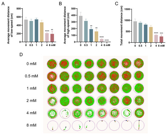 Effects of 96 h levofloxacin exposure on zebrafish larval swimming behavior. (A) Low-to-moderate speed movement distance of zebrafish larvae in each concentration group; (B) high-speed movement distance of zebrafish larvae in each concentration group; (C) total movement distance of zebrafish larvae in each concentration group; (D) swimming trajectories of zebrafish larvae in each concentration group. Green trajectories represent low-to-moderate speed movement (1–12 cm/s), and red trajectories represent high-speed movement (>12 cm/s). ** p < 0.01; *** p < 0.001; **** p < 0.0001 vs. 0 mM.