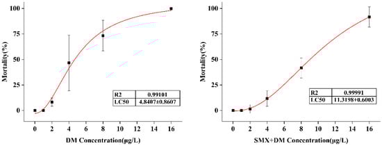 Wild-type AB adult zebrafish (approximately 6 months old) were obtained from the State Key Laboratory of the Chinese Academy of Environmental Sciences. The fish were maintained in a flow-through system at 27 ± 1 °C, 50 ± 10% relative humidity, and a 14 h:10 h light:dark cycle. Continuous aeration in water was employed to maintain dissolved oxygen levels above 7.72 mg/L, while conductivity was kept at 480 μS/cm, with minor fluctuations in these values possible. The fish were acclimatized for 14 days prior to the start of the experiment, during which they were fed freshly hatched brine shrimp (Artemia nauplii) twice daily. All experiments were conducted in accordance with the Guidelines for the Keeping and Use of Laboratory Animals of the Chinese Academy of Environmental Sciences. For the acute toxicity test, we conducted the experiment based on the OECD Test Guideline No. 203 for Fish, Acute Toxicity Testing. To avoid potential reproductive or hormonal differences that could influence behavior and neurochemical responses, only male zebrafish were used to assess the toxic effects of DM and SMX in this study. Adult male zebrafish (10 fish per parallel, 6 parallels per concentration group) were exposed to different concentrations of DM (0, 1.0, 2.0, 4.0, 8.0, and 16.0 μg/L) in a clear glass beaker containing 2 L of water for 96 h. Additional groups were exposed to the same concentrations of DM in combination with SMX (30 μg/L) for the same duration. The concentrations of SMX were selected based on environmentally relevant levels []. The DM concentrations were chosen based on prior toxicity studies in zebrafish, which demonstrated toxic effects at these concentrations and provided a foundation for evaluating potential ecological risks [,].