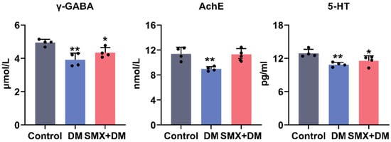 To investigate the neurotoxic effects of DM and its combination with SMX on neurotransmitter levels in adult zebrafish, we quantified γ-GABA, 5-HT, and AChE in the brain 96 h following acute exposure to 4 µg/L of DM and a combination of 4 µg/L of DM and 30 µg/L of SMX (Figure 2). The level of γ-GABA in the brain was significantly altered across the treatment groups. In the control group, the γ-GABA level was 4.94 ± 0.19 µmol/L, while in the DM group and the DM + SMX group, the levels were significantly reduced to 3.91 ± 0.39 µmol/L (p = 0.002) and 4.34 ± 0.30 µmol/L (p = 0.040), respectively. The significant decrease in γ-GABA levels following DM exposure suggests an impairment of inhibitory neurotransmission, which could be indicative of disruptions in GABAergic signaling pathways []. GABA is a crucial inhibitory neurotransmitter in the brain, and alterations in its levels may be associated with neurological disorders, including seizures and anxiety-like behavior []. The combined exposure to DM and SMX did not further exacerbate the reduction in γ-GABA levels, suggesting that while SMX may not directly affect GABAergic systems, its presence does not significantly enhance the neurotoxic effects of deltamethrin on GABAergic signaling. This finding indicates that the impact of SMX on neurotransmitter systems may be less pronounced compared to deltamethrin, and that any observed alterations in γ-GABA levels are primarily driven by deltamethrin exposure.