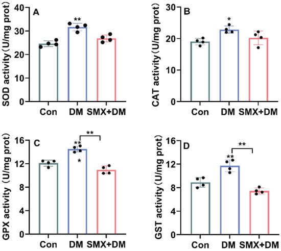 Previous studies have reported oxidative stress effects in zebrafish exposed to deltamethrin (DM), although the specific responses can vary depending on exposure conditions and chemical interactions []. To investigate the oxidative stress response in zebrafish brains after acute exposure to 4 µg/L of DM and the combination of 4 µg/L of DM with 30 µg/L of DM + SMX for 96 h, we measured the activities of key antioxidant enzymes, including superoxide SOD, CAT, GPX, and GST (Figure 3).
