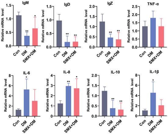The expression of IgM, IgD, and IgZ in the zebrafish brain was significantly reduced in both the DM and DM + SMX treatment groups compared to the control group. Specifically, IgM expression decreased from 1.13 ± 0.11-fold in the control group to 0.37 ± 0.13-fold (p < 0.01) in the DM group and 0.65 ± 0.41-fold (p < 0.05) in the DM + SMX group (Figure 4). Similarly, IgD expression was significantly downregulated in the treatment groups, dropping to 0.19 ± 0.22-fold (p < 0.01) in the DM group and 0.20 ± 0.18-fold (p < 0.01) in the DM + SMX group, compared to 0.98 ± 0.23-fold in the control group. For IgZ, the control group showed an expression of 1.25 ± 0.36-fold, while both the DM and DM + SMX groups exhibited significant reductions to 0.46 ± 0.17-fold (p < 0.01) and 0.37 ± 0.34-fold (p < 0.01), respectively. These findings suggest that exposure to DM and SMX suppresses immune-related pathways, particularly those involving immunoglobulins that are crucial for both systemic and mucosal immunity in zebrafish [], potentially impairing their ability to produce antibodies in response to pathogens.