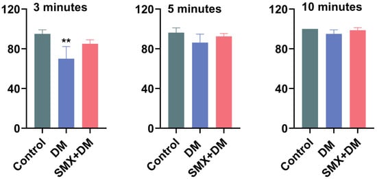 The feeding behavior of zebrafish was assessed by recording the number of pellets consumed at 3, 5, and 10 min after feeding, with results expressed as the ratio of consumed pellets to the total provided (Figure 5). At 3 min, the control group consumed 95.00 ± 4.08% of the pellets, while the DM group showed a significantly lower feeding rate of 70.00 ± 12.25% (p < 0.01), which suggested that DM exposure negatively impacts the immediate feeding behavior of zebrafish. However, the DM + SMX group did not significantly alter feeding behavior (85.00 ± 4.08%), indicating a potential mitigating effect of sulfamethoxazole on the feeding impairments caused by deltamethrin. Although feeding rates in the DM and DM + SMX groups slightly decreased at the 5 and 10 min time points compared to the control, no significant differences were observed at these time intervals. The impact on feeding behavior seemed to be short-lived, with no significant differences at later time points.