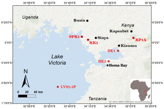 We retrieved parallel sediment cores of at least 100 cm in length from Siaya (KK1), Busia (SPK1), Homa Bay (HK2), and Kisumu (DK2) in 2015 (Table 1). A percussion corer (Atlas Copco AB, Sweden) with a PVC liner measuring 100 cm in length and 5.5 cm in diameter was used to capture the sediment cores. The peat core from Kapsabet (KP1A) was retrieved in 2014 using a Russian peat borer. The 50 cm core sections (half cores, 5 cm diameter) were stored in PVC pipes after retrieval and transported to Sweden, where they were preserved in a freezer at −20 °C until further processing. Clearance from the Ministry of Mining/Geological Survey Department, Government of Kenya, was obtained before the shipment of these cores. In 1996, a core (LV95-2P) was retrieved from Kenyan waters in the lake using a Kullenberg corer. The core is stored in the Large Lakes Observatory at the University of Minnesota—Duluth (Duluth, MN, USA), and upon request, samples were provided to us (courtesy of Professor Tom Johnson).
