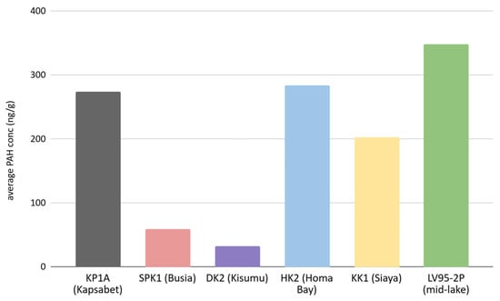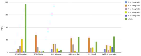 The distribution of PAHs across all study sites, ordered by abundance from highest to lowest, reveals the following sequence: naphthalene, phenanthrene, benzo[a]pyrene, benzo[b]fluoranthene, indeno[1,2,3-cd]pyrene, anthracene, fluoranthene, acenaphthylene, acenaphthene, benzo[ghi]perylene, pyrene, benzo[k]fluoranthene, dibenz[a,h]anthracene, chrysene, fluorene, and benz[a]anthracene. The concentrations (reported as ng/g dry weight) of the USEPA 16 PAHs listed as priority pollutants because of high toxicity range from 0.05 to 7011 ng/g, with several samples occurring below the detection limit of the calibration curve. The mean PAH concentration is notably highest at the LV95-2P site, with 353 ng/g. This is followed by KP1A (Kapsabet) at 270 ng/g, HK2 (Homa Bay) at 283 ng/g, KK1 (Siaya) at 200 ng/g, SPK1 (Busia) at 60 ng/g, and DK2 (Kisumu) at 31 ng/g (Figure 2).