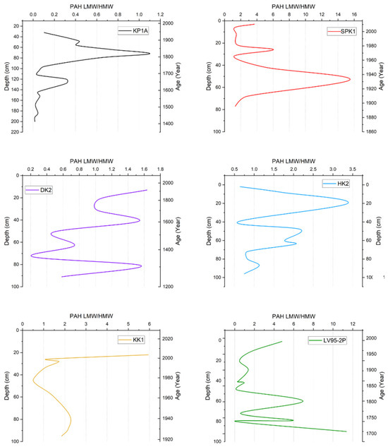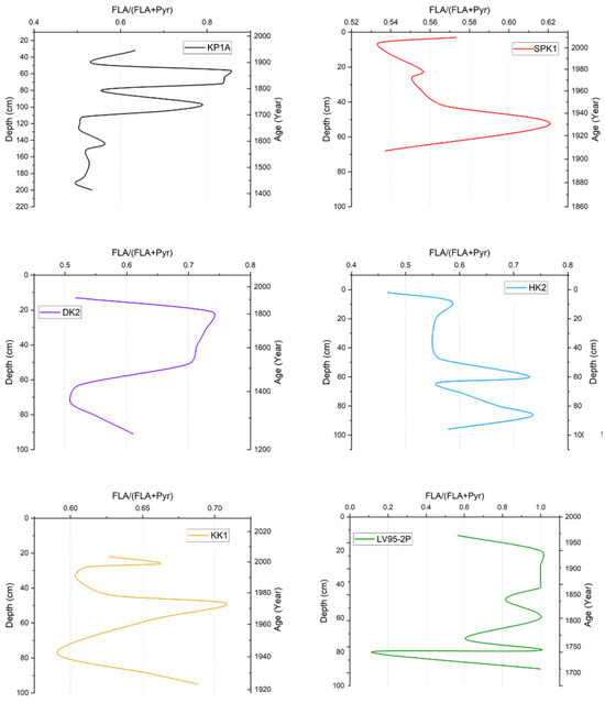 In KP1A, values were between 0.50 and 0.85 for fluoranthene/(fluoranthene + pyrene), as shown in Figure 4. The ratio was relatively low in the bottom half of the core but fluctuated between 0.50 and 0.90 for the top half of the core. In SPK1, the ratio ranged from 0.52 to 0.62. The ratio started at 0.50 at the bottom of the core before increasing to 0.62 at 50 cm. It then gradually decreased up the core to 0.52 (5 cm) and then increased slightly to 0.57 near the top. In DK2, the values ranged from 0.51 to 0.73. The ratio started at about 0.60 at the bottom and spiked between 20 and 50 cm, and then decreased to 0.51 near the top of the core. In HK2, the ratio was between 0.46 and 0.77. The ratios were mainly between 0.55 and 0.67, while two spikes occurred at 87 cm and 60 cm, respectively. A sudden decrease was observed near the top of the core at 2 cm. In KK1, the ratio ranged from 0.58 to 0.71, with substantial variability observed in the sediment layers. The LV95-2P core shows the most expansive range (0.2–1.0) in this ratio among all cores, with significant fluctuations throughout the temporal record from 1700 to 1950.