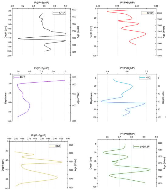 The IP/(IP + BghiP) ratio in KP1A was above 0.5, except for an anomalous decline to 0.10 at 140 cm (Figure 5). In SPK1, the ratio was between 0.42 and 0.52; the ratio started low and fluctuated in value up the core. In DK2, the ratio was within 0.60, which increased to 1.0 near the top of the core at 13 cm. In HK2, the ratios ranged between 0.33 and 0.77. The ratio fluctuated between 0.50 and 0.80 before it decreased sharply at 60 cm. In KK1, values ranged from 0.55 to 0.95. In LV95-2P, the ratio started at a relatively lower value at the base (0.60) and exhibited fluctuations up the core.