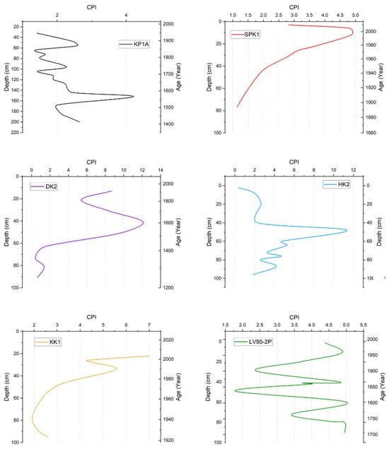 CPI values in KP1A were between 1.38 and 4.20; the values fluctuated up the core. In SPK1, the values were between 2.07 and 4.86 and were relatively low (1.20) at the base but increased progressively up the core, reaching a peak at 15 cm. However, the ratio then decreased to 2.75 near the top of the core. In DK2, the values were between 0.40 and 12.1. The top section had values between 5.00 and 12.0, whereas the bottom section had values between 0.40 and 1.50. In HK2, the CPI values ranged from 0.34 to 11.4. A similar trend was observed in KP1A, where the values gradually decreased up the core. However, in HK2, the ratio increased to around 48 cm. In KK1, values were between 2.00 and 7.00 and generally increased up the core. Lastly, in LV95-2P, the value fluctuated between 1.75 and 5.00 (Figure 9).
