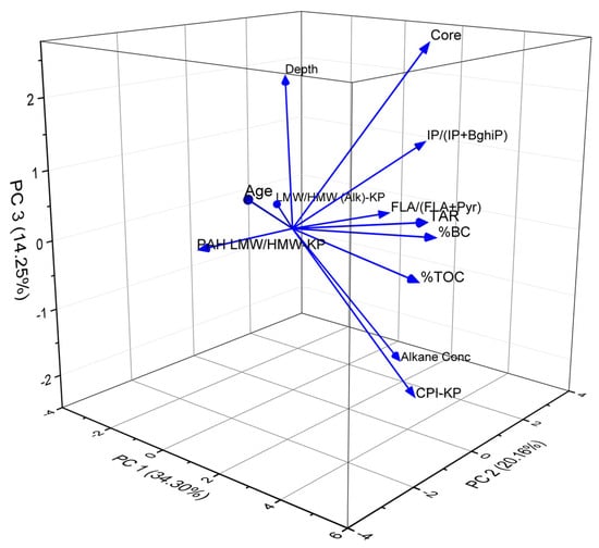 The PCA results revealed complex interactions between various geochemical parameters, including the distribution pattern of pollutants and their sources, while indicating the underlying trends in the dataset (Figure 10). PCA identified three principal components (PCs) that captured the majority (68.71%) of the variance in the dataset. PC1 accounted for 34.3% of the variance and was primarily influenced by the TAR (0.45), TOC (0.41), BC (0.39), and CPI (0.34). PC2 explained 20.2% of the variance and was significantly influenced by age (−0.50), n-alkane concentration (0.41), IP/(IP + BghiP) (0.37), and depth (0.35). PC3 accounted for 14.3% of the variance and was dominated by the core location (0.54), alkane concentration (−0.49), CPI (−0.44), and depth (0.38).