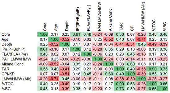 Correlation matrix of TOC, BC, PAH, and n-alkanes in the Lake Victoria catchment. Green denotes positive values, whereas red denotes negative values.