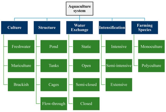 Aquaculture is the farming of aquatic species commonly associated with fish [25]. However, it covers animal- and plant-based aquatic species, such as fish, crustaceans, seaweeds, algae, microalgae, and mollusks. The sector also involves farming or culture in freshwater, brackish, and seawater (mariculture), depending on the type of aquatic species. The classification of aquaculture systems based on their culture, structure, water exchange, intensification, and farming species are depicted in Figure 1.