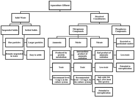 Concerns about the environmental effects of water pollution from aquaculture wastewater effluents have been discussed over the years. Organic contents from fish feed and feces may cause environmental deterioration in external water bodies [73]. The characteristics of aquaculture effluent are highly varied, depending on the system used and the cultured species [46,74,75]. Generally, aquaculture effluents can be classified into two segments, namely solid waste and dissolved waste [56,76], as shown in Figure 3.