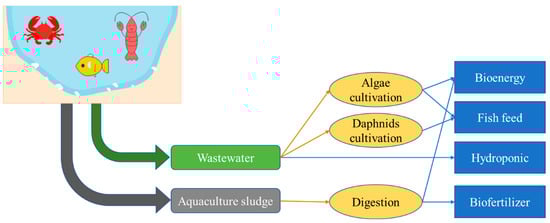 The focus of aquaculture wastewater valorization is to convert its pollutant parameters (mostly nutrients), which may produce side products that have additional value. The conversion of nutrient contents in aquaculture wastewater can be conducted in three main products: daphnids, algae, or plants. Different cultivation systems can be selected based on the characteristics of the wastewater being processed. Very high concentrations of nutrients characteristics are suitable for algae cultivation and hydroponic scheme [111], whereas moderate concentrations of nutrients are more suitable for daphnid cultivation [112]. For aquaculture sludge, valorization is focused on concentrating and converting the nutrient contents into liquid form. Although the direct utilization of aquaculture sludge has a positive effect on plant growth, it produces an unpleasant odor caused by the degradation of organic materials and N in the sludge [113]. Related to this, the valorization of aquaculture wastewater and sludge places additional value on the previously unwanted waste because they can make contributions by generating additional revenue and reducing the cost of running aquaculture production systems [114,115].