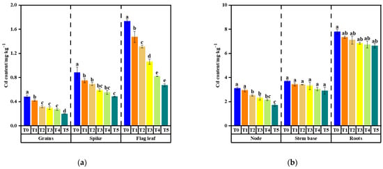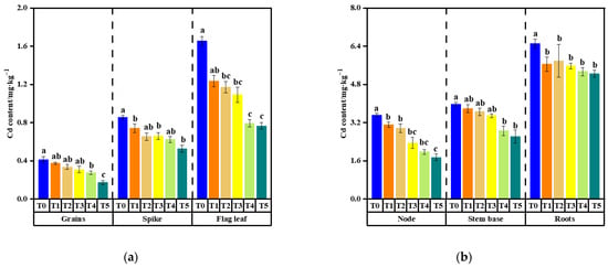 The Cd and As content in rice organs at the mature stage exhibited significant variation, with aboveground tissues containing substantially lower levels of Cd/As compared to underground organs (Figure 1 and Figure 2). The roots of X24 and Z35 rice varieties displayed the highest Cd/As content, with Cd content ranging from 5.25 mg·kg−1 to 6.51 mg·kg−1 and 6.63 mg·kg−1 to 7.80 mg·kg−1, respectively. Correspondingly, As content was between 95.31 mg·kg−1 and 101.52 mg·kg−1 for X24 and 94.16 mg·kg−1 and 103.65 mg·kg−1 for Z35. The second-highest Cd/As content was observed in the stem base, while the panicle had the highest content among the aboveground tissues.