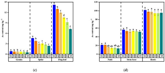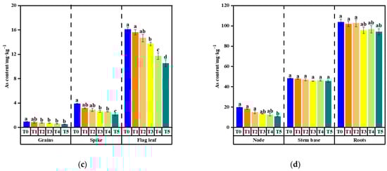 Effects of varying [Glu][H2PO4] concentrations on Cd (a,b) and As (c,d) accumulation in X24 rice organs. Treatments T0 to T5 correspond to foliar applications of 0, 0.2, 0.5, 0.8, 1.2, and 1.5 mmol·L−1 [Glu][H2PO4], respectively. Error bars represent standard deviations, and letters (a–f) denote significant differences among treatments (p < 0.05).