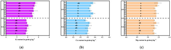 Figure 3 delineated the nutrient profiling of six mineral elements (K, Ca, Mg, Fe, Mn, and Zn) in rice grains and flag leaves across cultivars. The results indicated that K was the most abundant element in both rice grains and flag leaves, with content ranging from 3.634 to 4.092 g·kg−1 in X24 grains and 4.801 to 5.390 g·kg−1 in Z35 grains. Mg was the second-most abundant element, followed by Ca. Notably, Ca content in grains was measured to be 0.294~0.324 g·kg−1 (X24) and 0.319~0.373 g·kg−1 (Z35), while trace elements (Fe, Mn, and Zn) maintained substantially lower content (0.02~0.05 g·kg−1). [Glu][H2PO4] foliar application had no significant effect on the content of these six nutrients in grain. In flag leaves, K content reached 15.153 to 17.285 g·kg−1 in X24 and 15.717 to 16.359 g·kg−1 in Z35. Ca content in X24 and Z35 flag leaves ranged from 8.299 to 13.092 g·kg−1 and 9.482 to 14.109 g·kg−1, respectively. With increasing [Glu][H2PO4] concentration, Ca content in both X24 and Z35 flag leaves increased significantly by 56.89% and 48.80%, respectively. Mn content in X24 and Z35 flag leaves was between 0.613 and 0.821 g·kg−1 and 0.798 to 1.041 g·kg−1, respectively. Contrastingly, Mn content exhibited inverse correlation with treatment intensity, declining 25.36% (X24) and 23.08% (Z35). The content of other elements did not change significantly.