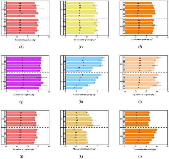 Effects of different treatments on the content of essential elements in grain (a–f) and flag leaf (g–l) of X24 and Z35 rice. The experimental groups (T0–T5) correspond to graded concentrations of 0, 0.2, 0.5, 0.8, 1.2, and 1.5 mmol·L−1 [Glu][H2PO4] applied through foliar treatment. Error bars denote triplicate standard deviations. Superscript letters (a–d) mark significant intergroup variations (ANOVA, p < 0.05).