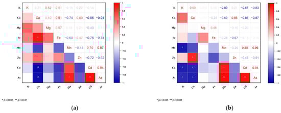 In the Pearson correlation analysis panel for the content of Cd/As and essential elements (K, Ca, Mg, Fe, Mn, and Zn) in the flag leaves of X24 (a) and Z35 (b) rice varieties under different [Glu][H2PO4] treatments. Significance thresholds: “*” means p < 0.05, “**” means p < 0.01.