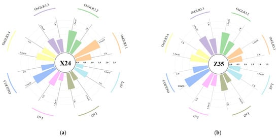 Effects of [Glu][H2PO4] on OsGLR3.1–OsGLR3.5 and OsLis1–3 relative expression levels in flag leaves of X24 (a) and Z35 (b) rice.