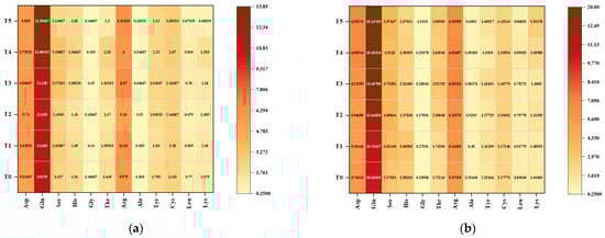 Effects of different treatments on amino acid contents in X24 (a) and Z35 (b) rice grains. These are two labeled heat maps: the horizontal coordinate represents various amino acids, and the vertical coordinate represents six treatments. The experimental groups (T0–T5) correspond to graded concentrations of 0, 0.2, 0.5, 0.8, 1.2, and 1.5 mmol·L−1 [Glu][H2PO4] applied through foliar treatment.
