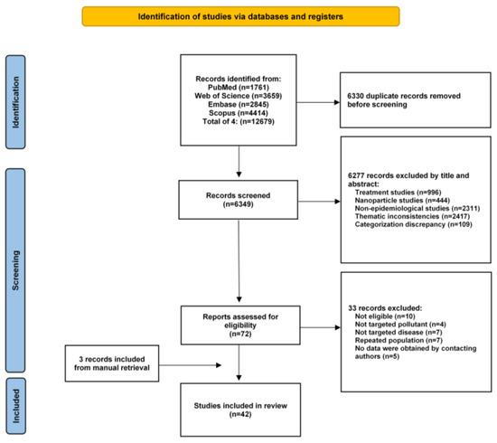 Among the 12,679 initially identified articles, 6349 titles and abstracts were reviewed after duplicate publications were removed. Of these, 6277 articles on irrelevant topics, including treatment studies, nanoparticle studies, non-epidemiological experiments, thematic inconsistencies, and categorization discrepancy (books, conferences, and non-English articles), were excluded. A total of 72 and 3 articles identified by manual search in previously published meta-analyses were reviewed carefully, and 42 eligible articles were finally included. The flow diagram illustrating our publication selection procedure is provided in Figure 1. The results of the quality assessment of these selected studies are presented in Tables S4 and S5.