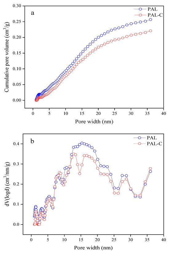 The pore size distribution of palygorskite (PAL) and modified palygorskite (PAL−C). (a) Cumulative pore volume; (b) change rate of pore volume with respect to pore width.