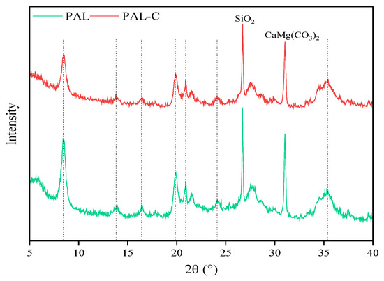 The spectra for X-ray diffraction (XRD) of palygorskite (PAL) and modified palygorskite (PAL−C).