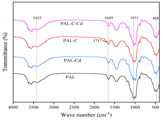 The infrared spectra of palygorskite, modified palygorskite, and the Cd adsorption product are shown in Figure 4. Changes in absorption peak position are not observed among different treatments. The stretching vibration peak of the hydroxyl group in structural water (-OH), the bending vibration peak of the hydroxyl group in zeolitic water (H-O-H), and the stretching vibration peak of the silanol group (Si-OH) are detected at 3423 cm−1, 1649 cm−1, and 1031 cm−1. The new stretching vibration peak of carboxyl (-COOH) is found at 1717 cm−1 on the surface of modified palygorskite. The intensity of the vibration peak of the silanol group (Si-OH) is weaker in the Cd adsorption product than in palygorskite due to the formation of Cd(OH)2. The peak of carboxyl (-COOH) disappears after Cd absorption onto modified palygorskite owing to the complexation between Cd and carboxyl [20,21].