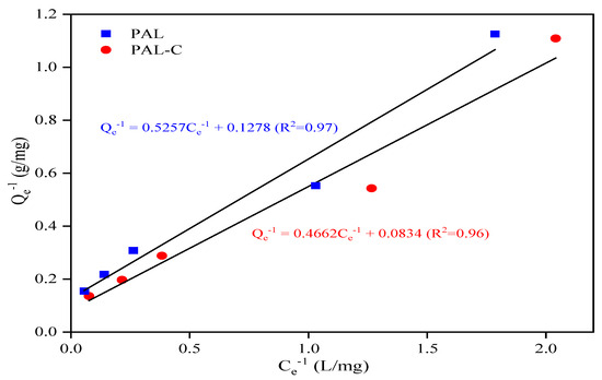 The Langmuir isotherm adsorption linear fitting of palygorskite (PAL) and modified palygorskite (PAL−C).