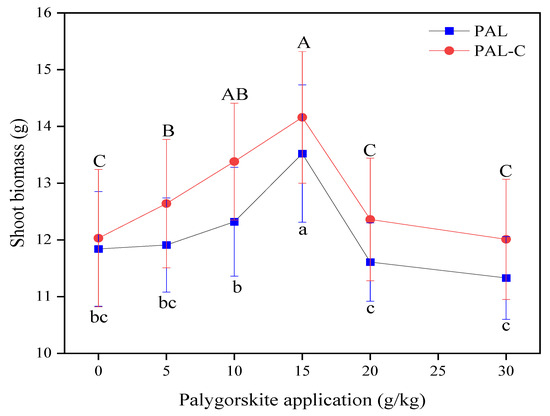 The biomasses (fresh weight) of shoots of plants grown in palygorskite (PAL)- and modified palygorskite (PAL−C)-treated soils. The data represented in the graph are means ± standard deviations. The means with different letters are significantly different for different clay applications (lowercase letter for PAL, uppercase letter for PAL−C) (n = 3, p < 0.05).