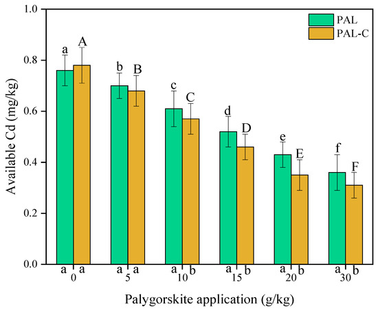 The contents of available Cd in palygorskite (PAL)- and modified palygorskite (PAL−C)-treated soils. The vertical bars represent means ± standard deviations. The different letters above bars are significantly different for different clay applications (lowercase letter for PAL, uppercase letter for PAL−C) (n = 3, p < 0.05). The different letters below the X axis are significantly different for PAL and PAL−C with the same clay application (p < 0.05).
