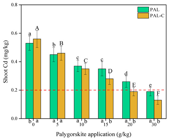 The concentrations of Cd in the shoots of plants grown in palygorskite (PAL)- and modified palygorskite (PAL−C)-treated soils. The vertical bars represent means ± standard deviations. The different letters above bars are significantly different for different clay applications (lowercase letter for PAL, uppercase letter for PAL−C) (n = 3, p < 0.05). The different letters below the X axis are significantly different for PAL and PAL−C with the same clay application (p < 0.05).