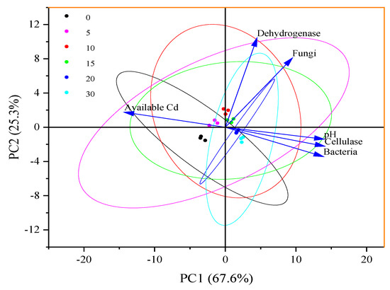 Principal component analysis for pH, available Cd, bacteria, fungi, dehydrogenase, and cellulase in soils. PC1 and PC2 represent the first and second principal components, respectively.