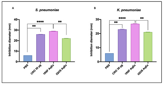 Barplot illustrating inhibition zones measured in the agar diffusion test for (A) S. pneumoniae and (B) K. pneumoniae, respectively. Data are reported as means + SD. Statistical significance was indicated as ** p < 0.01, **** p < 0.0001.