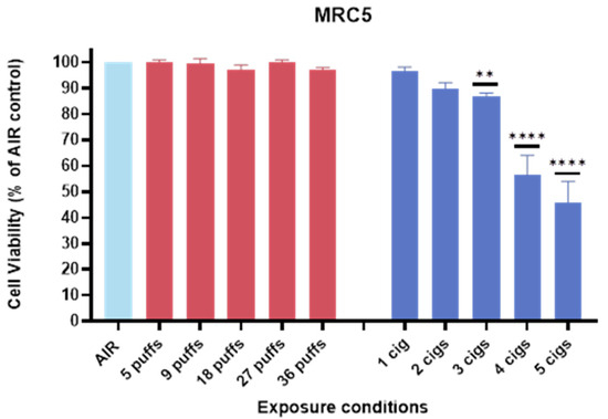 Barplot illustrating MRC-5 cell viability following exposure to THP aerosol (up to 36 puffs) and 1R6F smoke (up to 5 cigarettes). Data are expressed as percentage of the respective air control and displayed as means ± SD, based on 9 replicate wells from triplicate transwell experiments. Statistical significance was indicated as ** p < 0.01, **** p < 0.0001.