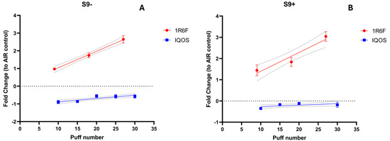 Mutagenicity assessment using the Ames test was conducted on S. typhimurium TA98 without (A) and with (B) S9 metabolic activation following exposure to 1R6F combustible cigarette smoke (red lines) or IQOS (blue lines). Results were expressed as fold change relative to the air control. The means ± SD of revertant colonies in solvent controls for TA98 during 1R6F experiments were 20.20 ± 2.56 (S9−) and 29.8 ± 13.72 (S9+), whereas for IQOS experiments, they were 5.53 ± 1.95 (S9−) and 6.46 ± 1.59 (S9+). Each data point represents the mean ± SD from triplicate Petri dishes. Dashed lines indicate the 95% confidence interval of the regression line.